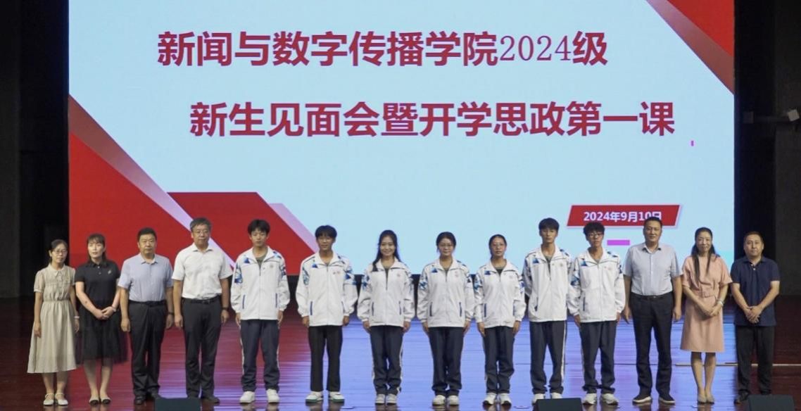 学院优秀校友代表郑州报业集团中原网教育频道首席记者王煜枫向2024级新生分享了自己的传媒行业从业经历,勉励大家要锐意进取,不畏艰难,勇攀知识的高峰。见面会上,学校和学院领导为新生代表佩戴校徽。