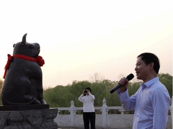 岳德军社长在南裹头广场、花园口将军像、将军坝、引黄闸及镇河铁犀等处为师生讲解