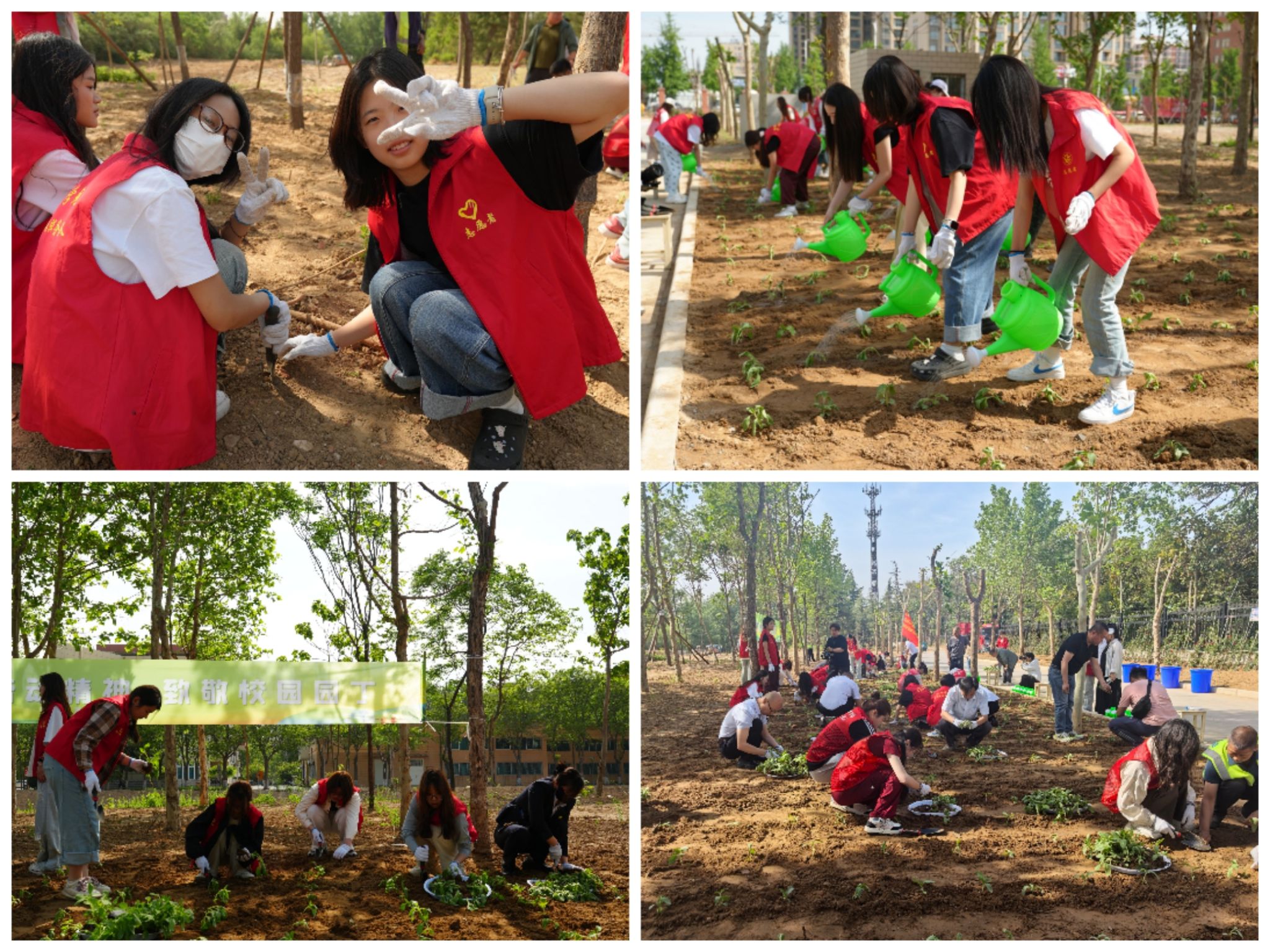 学生以专业角度记录种植瞬间,以“智育”夯实劳动技能、专业基础;师生协作栽苗扶土浇水,在“劳育”中锤炼意志品质;栽种幼苗成排成列,用“美育”装点生态校园;烈日之下师生躬身劳作,体会园丁辛苦,以“德育”厚植责任担当。