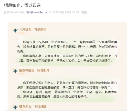 教育是一场温暖人心的修行。学院在新传NewMedia微信公众号推出的《师恩如光,微以致远》一文,宛如细腻画卷,深情赞颂教师的无私付出与高尚情怀。字里行间饱含深情,触动心灵,让人深刻感受教育精神的传承与弘扬。