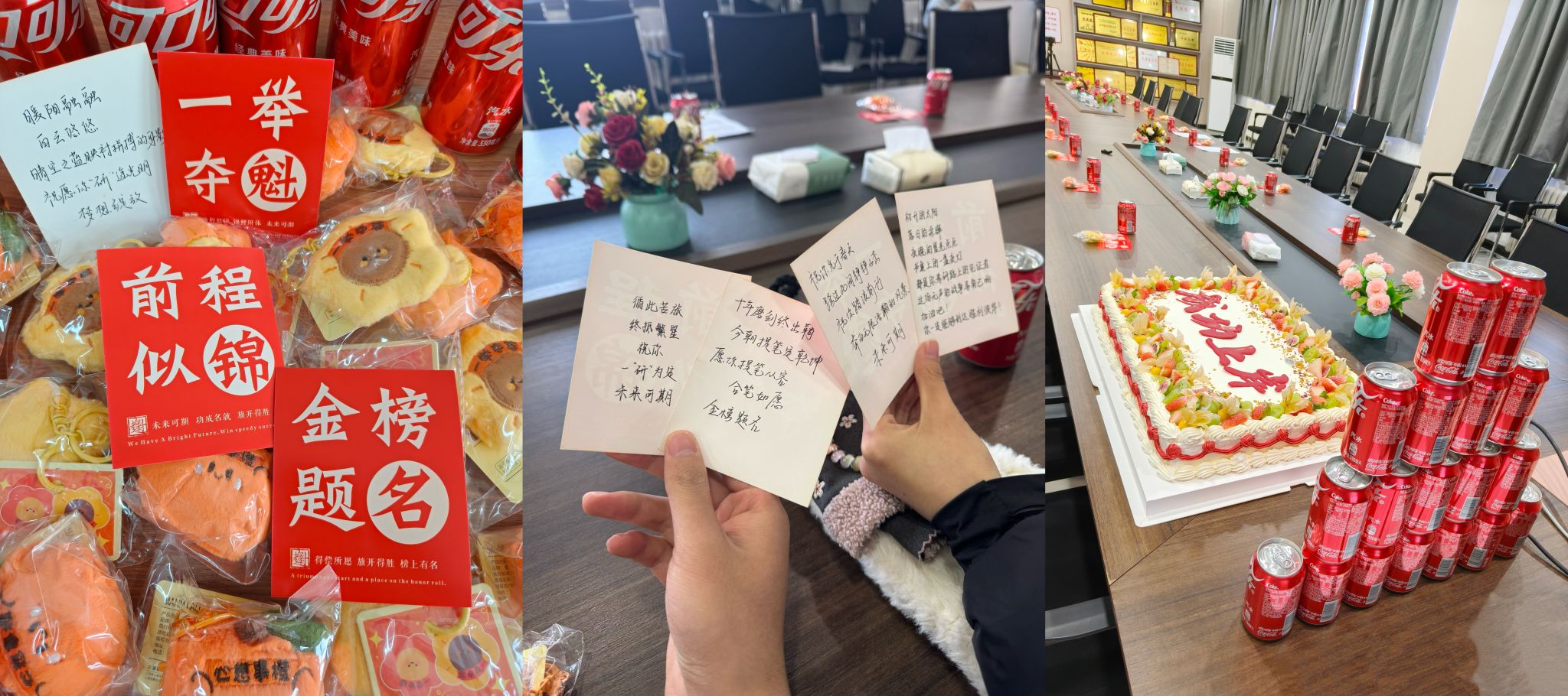 活动伊始,杨静勉励考生既然选择研途,便要全力以赴坚定前行,这份经历终将成为生命中珍贵的馈赠,同时叮嘱同学们要注意劳逸结合,保证体力,以充沛的精力坚持到底。崔涛指出考研是人生的重要转折点,学院永远是大家最坚实的后盾,希望同学们保持良好心态,科学备考,以最佳状态迎接挑战。蒋东升结合自身求学经历,向考生分享备考途中要学会为心灵减负轻装上阵,不要因暂时的迷茫动摇初心。活动最后,学院领导为考研学子们送上了“暖心大礼包”,包含有专属寓意的小礼物、学弟学妹们手写的祝福卡片以及“上岸蛋糕”等,将温暖与祝福传递到每位同学手中。同学们纷纷表示备受鼓舞,将把学院的关爱转化为备考动力,沉着应考、全力以赴,力争在考研中取得优异成绩。