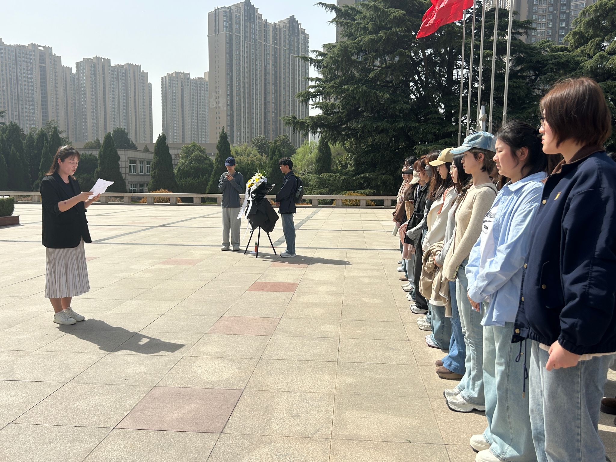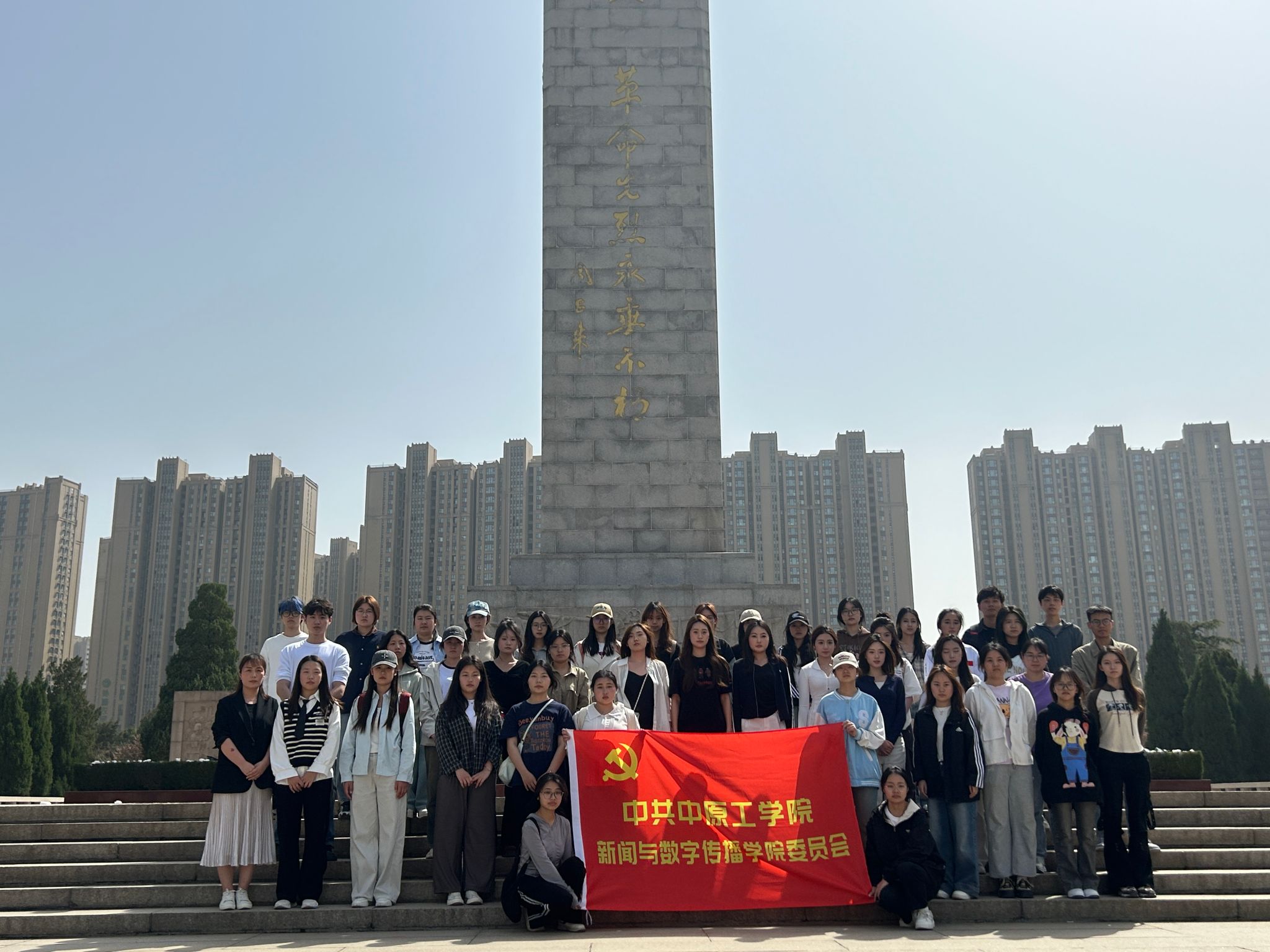 下午2时许,师生抵达郑州市烈士陵园,陵园里松柏环抱,绿荫满园,肃穆庄重。在陵园纪念碑平台广场,全体师生肃立于纪念碑前, 学生代表向革命烈士纪念碑敬献花篮,全体师生鞠躬默哀,深切悼念为民族独立、人民解放和国家富强献出生命的英雄先烈。 默哀完毕,马肖华通过缅怀革命先烈的英雄事迹,号召大家要以革命先烈的精神为指引, 不忘初心、牢记使命, 用新闻人的责任与担当,书写无愧于时代、无愧于人民的答卷。