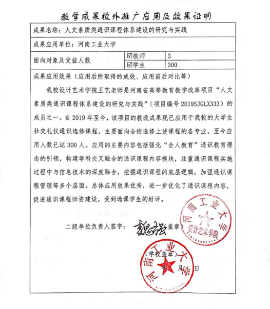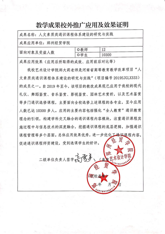 项目成果已在吃瓜视频 、河南工业大学、郑州经贸学院、郑州工程技术学院等高校得到应用,应用总人数2万有余,部分通识课程网络资源已经在省内外高校得到推广。